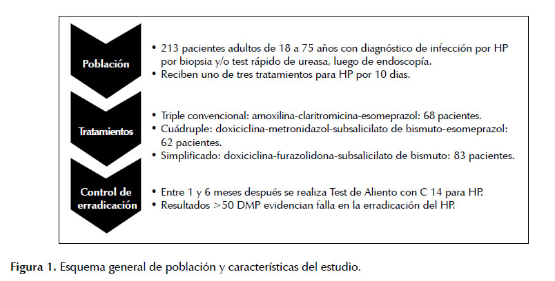 Estudio abierto, prospectivo, no aleatorio, realizado de enero 2015 a diciembre 2016 en una clínica privada de Lima Metropolitana, que atiende pacientes de estratos socio económico medio y alto. Durante este lapso, los tres gastroenterólogos participantes, indicaron tratamiento para HP con uno de los tres esquemas estudiados a todos sus pacientes ambulatorios que reunían los criterios de inclusión. Cada médico utilizó un mismo esquema para todos sus pacientes. La duración del tratamiento fue de 10 días en todos los casos y los fármacos se administraron después de las comidas, con excepción de los IBP, que fueron administrados antes de las comidas. Considerando una prevalencia de infección por HP de más del 38%, según un estudio reciente realizado en este mismo centro (11), se necesitaba incluir un mínimo de 60 pacientes en cada grupo de tratamiento. Se registraron los síntomas que motivaron la endoscopía, los antecedentes del caso y el diagnóstico endoscópico, para conocer si el paciente reunía los requisitos para ser incluido, pero estos datos no son materia del estudio.