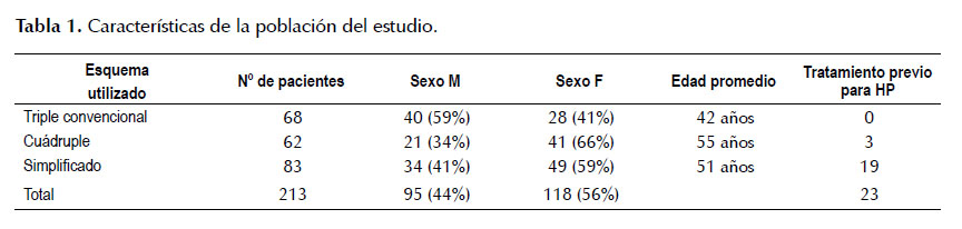 Completaron los requisitos de inclusión y fueron considerados evaluables un total de 213 pacientes; 68 con el esquema triple convencional, 62 con el esquema cuádruple y 83 con el esquema simplificado (Figura 1).