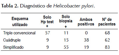 En el grupo que recibió el esquema Simplificado hubo una mayor proporción de pacientes que ya habían recibido antes tratamiento para HP. El diagnóstico se hizo en base a la positividad en la prueba de ureasa y/o la biopsia ( Tabla 2). Hubo alguna diferencia en cuanto el uso de estos métodos diagnósticos entre los grupos, debido a las preferencias de los tres médicos participantes.