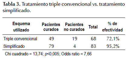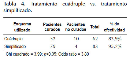 El esquema simplificado también logró superar al cuádruple, el cual logró la erradicación en un 83,9% (52/62), siendo esta diferencia también significativa (chi cuadrado 3,99, p <0,05) (Tabla 4).