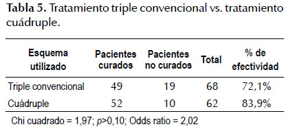 Al comparar los índices de erradicación del esquema cuádruple frente al esquema triple convencional se encontró que el cuádruple obtuvo mejores resultados (83,9% vs. 72,1%) pero esta diferencia no alcanzó valor estadístico (chi cuadrado 1,97, p>0,10) (Tabla 5).