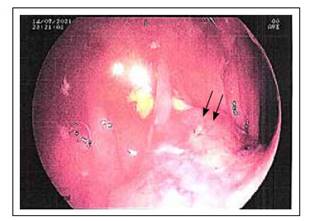 Figura 1 A nivel de la mucosa próxima a ciego, se identifica lesión proliferativa, ulcerada, de bordes elevados y friables, no estenosante.