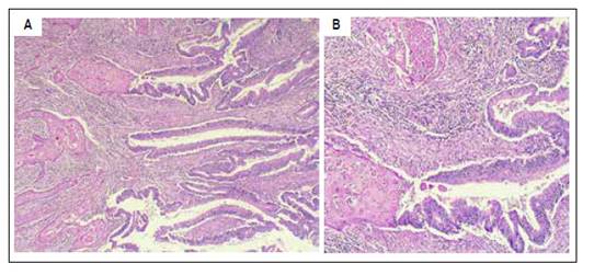 Figura 2 (A y B) Carcinoma adenoescamoso caracterizado por contener tanto componente de adenocarcinoma como de carcinoma escamoso. (B) A mayor aumento, se observa como el componente de carcinoma adenoescamoso se diferencia o transforma a partir del adenocarcinoma