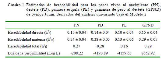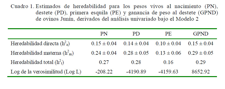 El estimado de h2a para PE es similar al reportado por Huapaya (1985), pero inferior a los valores referidos por Bradford et al. (1989) y Safari et al. (2005). Igualmente, h2m es similar a los estimados encontrados por Safari et al. (2005) y Ozder et al. (2009). Los estimados de h2a y h2m para GPND concuerdan con los reportados por Huapaya (1985) y Snowder y Van Vleck (2003), respectivamente.