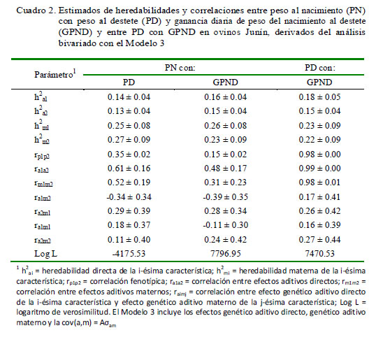 El Cuadro 2 presenta los estimados de heredabilidades y correlaciones derivados del análisis realizado, entre PN con PD y GP, y entre PD con GPND. Las demás combinaciones entre pares de características no se presentan porque presentaron valores indeterminados.