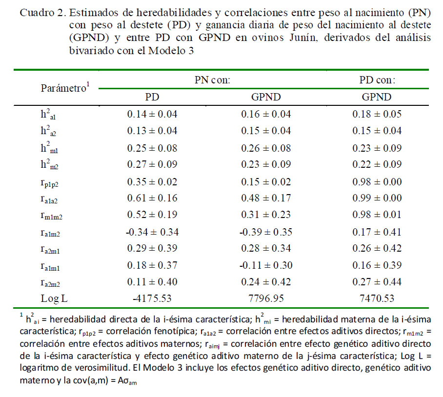 Los modelos para el análisis bivariado fueron extensiones del univariado. Los estimados de correlación fenotípica (rp1p2), genética (ra1a2), maternal (rm1m2) y entre efectos genético directo y maternal (ra1m2) se obtuvieron a partir de las ecuaciones planteadas por Näsholm y Danell (1996) y Gilmour et al. (2006):