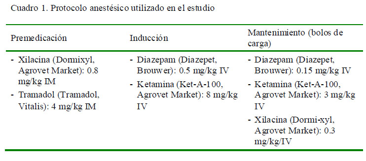 Se trabajó con 10 caninos hembras de diversas razas. Los animales tenían entre 10 meses y 6 años de edad, tamaño y peso variado, clínicamente sanos. En el análisis de laboratorio presentaron hemograma y leucograma normal, clasificados como ASA I y ASA II. Las perras fueron sometidas a cirugía electiva de ovariohisterectomía. El estudio fue aprobado por el Comité Institucional de Ética de la Investigación de la UCSM. El protocolo anestésico se indica en el Cuadro 1.