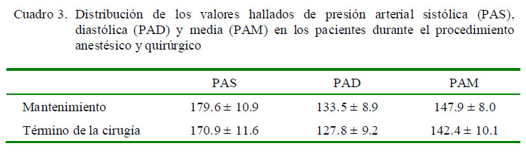 Los valores de frecuencia respiratoria y cardiaca (x minuto) y los porcentajes de saturación de oxígeno se presentan en el Cuadro 2. Los valores de presión arterial sistólica (PAS), diastólica (PAD) y media (PAM) se presentan en el Cuadro 3. El pulso permaneció dentro de los rangos normales durante todo el procedimiento. La temperatura corporal sufrió un descenso gradual conforme transcurría el procedimiento quirúrgico, pero sin alteraciones relevantes.
