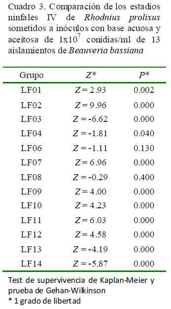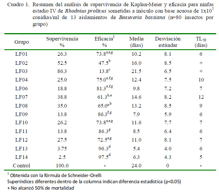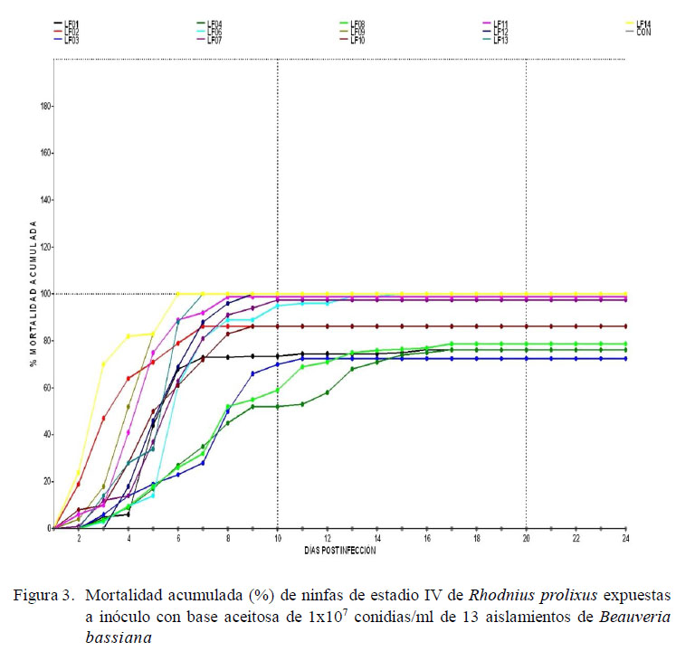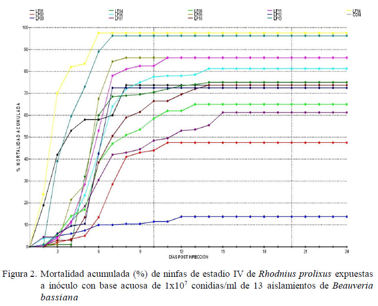 Los aislamientos originales de B. bassiana LF14 y LF13 fueron obtenidos a partir de cadáveres de insectos del orden Coleóptera (Cazorla y Morales, 2010), por lo que su patogenicidad sobre las ninfas IV de R. prolixus puede considerarse como inespecífica. Más aún, ambos aislamientos fueron más virulentos hacia las ninfas de R. prolixus que los aislamientos LF01 y LF07, aislados originalmente de cadáveres esporulados de triatominos, y particularmente de R. prolixus en el caso de LF01. Esto sugiere que la especificidad «hospedadorpatógeno » no fue tan estricta como fue observada en otro estudio donde solo las cepas aisladas de Hemípteros resultaron altamente patogénicas para R. prolixus (Romaña y Fargues, 1987).