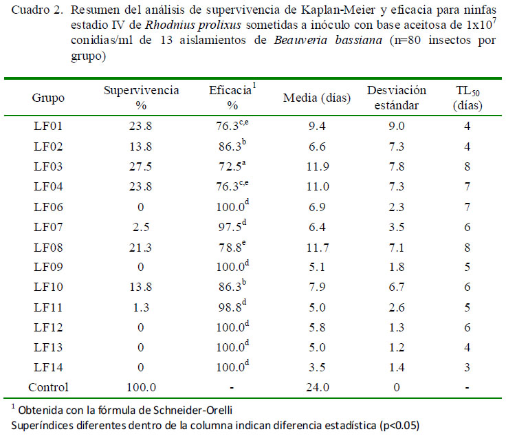 Al determinarse la acción biocontroladora de los 13 aislamientos de B. bassiana con base acuosa sobre las ninfas IV de R. prolixus, se encontró que los mayores porcentajes de mortalidad acumulada, eficacia y menores TL50 fueron causados por los aislamientos LF14 y LF13 (97.5, 97.5 y 5; 96.3, 96.3 y 6, respectivamente). Por contraste, los aislamientos LF03 y LF02 obtuvieron los menores porcentajes de mortalidad acumulada y eficacia (13.8, 13.8 y 47.5, 47.5, respectivamente), sin llegar a alcanzar el 50% de mortalidad en los insectos (Cuadro 1, Figura 2). Los porcentajes de esporulación en los cadáveres de las ninfas fueron superiores a 88% cuando los insectos se expusieron a todos los aislamientos.