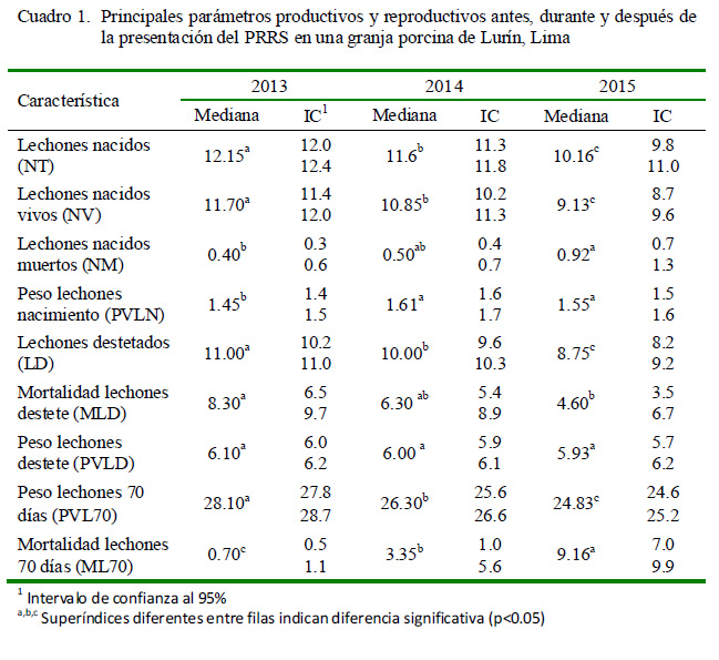 El comportamiento productivo se detalla en el Cuadro 1. La presentación del PRRS ocasionó un incremento significativo (p<0.05) en el número de NM y PVLN de 2.3 veces y 6.8%, respectivamente, y una disminución significativa (p<0.05) de NT de 16.4%, de NV de 22.0%, de MLD de 44.6% y de LD de 20.5%. Por otro lado, el PVLD fue similar en los tres años de evaluación.