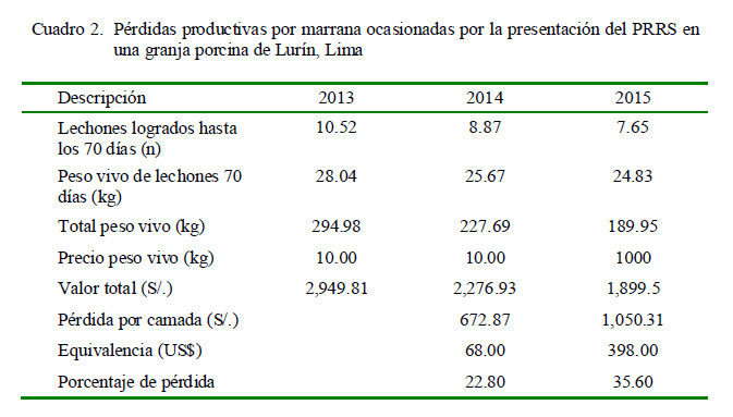 En los animales en crecimiento (destete 70 días) se generó un menor y significante (p<0.05) PVL70 de 11.6% y una mayor ML70, que se incrementó en 13 veces en el año pos-presentación. En 2014 y 2015 se obtuvieron 1.65 y 2.87 lechones menos hasta los 70 días en comparación con 2013, año donde no se registró el PRRS. Esta menor producción originó una pérdida potencial estimada de 22.8% y 35.6% para los años 2014 y 2015, respectivamente (Cuadro 2).
