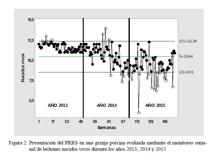 En la Figura 2 se observa el monitoreo semanal del PRRS mediante la evaluación de los lechones NV. A partir de la semana 83 (tercera semana de agosto de 2014) se registra una disminución progresiva de NV que sobrepasa el LCI (8.51) en varios puntos que corresponden a las últimas semanas de 2014 y en 2015. En las últimas semanas de 2015 se observa una recuperación de los NV (semana 154). La disminución anormal de NV tuvo una duración de 71 semanas, donde la mediana fue de 9.13, inferior en 21.8% a la mediana de 11.70 de 2013.