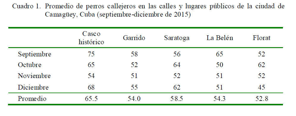 Se realizó un censo de la población canina que deambula en el casco histórico y en los barrios de Garrido, Saratoga, La Belén y Florat, de la ciudad de Camagüey, durante los meses de septiembre a diciembre de 2015.