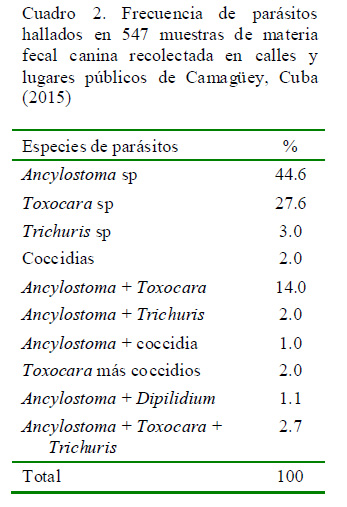 Con el objetivo de estimar la población de perros callejeros en Camagüey, Cuba, se realizó un censo de la población canina callejera en cuatro barrios de la ciudad de Camagüey durante los meses de septiembre a diciembre de 2015. Se recopilaron datos sobre sexo del perro, presencia de ectoparásitos (garrapatas y pulgas) y enfermedades dermatológicas. Asimismo, se recolectó material fecal encontrado en calles y centros públicos. El número de perros por barrio varió entre 45 y 75, donde el 62% de las observaciones correspondieron a perros con lesiones en piel o con presencia de ectoparásitos. El 61.7% de las muestras fecales fue positiva a huevos de parásitos gastrointestinales, mayormente de los géneros Ancylostoma y Toxocara.