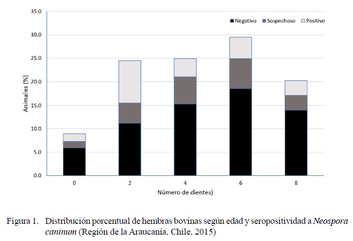De las 437 muestras analizadas, 327 correspondieron a vacas y 110 a vaquillas. El análisis en las vacas (4, 6, 8 dientes) se encontró 68 positivas, 50 sospechosas y 209 negativas, en tanto que en las vaquillas (0, 2 dientes) hubieron 24 positivas, 11 sospechosas y 75 negativas (Figura 1). Los resultados indican seroprevalencias similares para vaquillas (21.8%, 24/110) y vacas (20.8%, 68/327), en concordancia con los resultados presentados por Escalona et al. (2010). Por otro lado, Davison et al. (1999) y GarcíaVázquez et al. (2005) encontraron una menor seroprevalencia en animales jóvenes en comparación con aquella en animales de mayor edad.