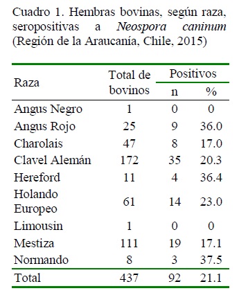 En Chile, las pérdidas ocasionadas por los abortos bovinos no han sido del todo cuantificadas, pero son económicamente importantes. Más del 50% de los episodios abortigénicos son de etiología desconocida y, de los diagnosticados, la mayoría corresponden a causas infecciosas (Patitucci et al., 1999). Estos investigadores evaluaron establecimientos lecheros de la IX Región demostrando la presencia de anticuerpos contra N. caninum en vacas que presentaron abortos y mediante el uso de la inmunohistoquímica confirmaron la enfermedad en el país. El objetivo del presente estudio fue determinar el estado actual de la seroprevalencia de neosporosis en hembras bovinas ingresadas en una feria ganadera local, donde llegan en promedio 300 bovinos por día de feria procedentes de diversas localidades de la región de la Araucanía.