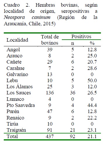 El origen de los animales muestreados y su estado sanitario para neosporosis se muestra en el Cuadro 2. El mayor número de animales provenía de las comunas más cercanas a la feria, tales como Los Sauces y Traiguén. No obstante, las mayores seroprevalencias se encontraron en animales procedentes de las comunas de Lebu (50%) y Puerto Saavedra (44.4%), aunque el número de animales muestreados fue relativamente bajo. El mayor número de animales procedió de Los Sauces (n=36), donde la seroprevalencia fue de 26.5% (Cuadro 2).