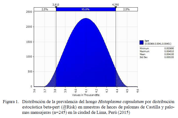 El programa de simulación estocástica beta-pert (@Risk) determinó una prevalencia mínima de 0.369% y máxima de 0.451% de H. capsulatum en heces de palomas domésticas en la ciudad de Lima.