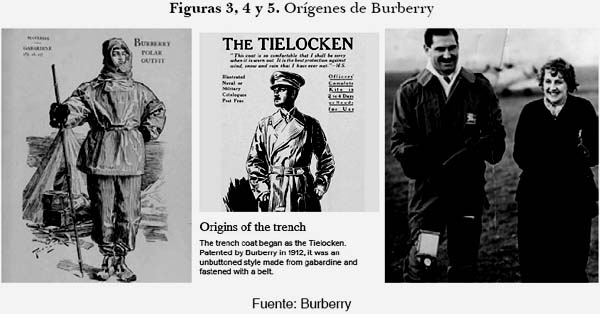 4 La Gabardina resultaba excelente para hacerle frente a condiciones inhóspitas: incluso se utilizaba en tiendas de campaña por sus cualidades ligeras y resistentes al viento. Disponible en https://es.burberry.com/nuestra-historia/ Consultado el 16 de junio de 2017.