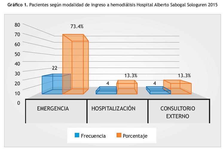 La ocupación de los pacientes se distribuyó en 36.7% como "su casa", 33.3 % como jubilado, 20% como independiente, y el 10% como empleado. La modalidad de ingreso a la terapia de hemodiálisis se observa en el (Gráfico 1). El 73.4% (22/30) ingresó por emergencia, 13.3 % (4/30) por consultorio externo, y 13.3% (4/30) por hospitalización.