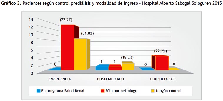 En los que tuvieron control sólo por nefrólogo (18 pacientes), el 72.2% (13) ingresaron por emergencia, 22.2% (4) por consultorio y 5.6% (1) por emergencia; de los que no tuvieron ningún control en pre diálisis (11 pacientes) el 81.8% (9) ingresó por emergencia y sólo el 18.2% (2) lo hizo por hospitalización (Gráfico 3).