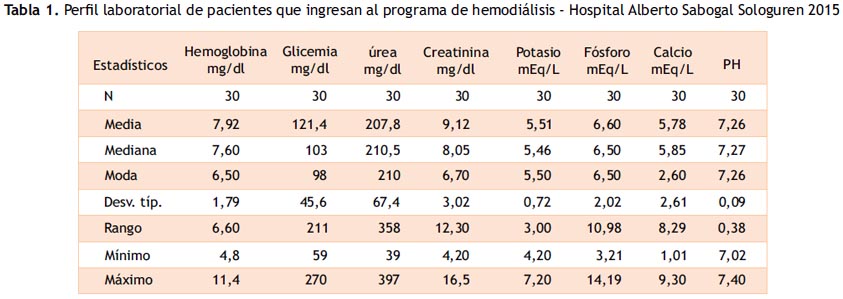 Material and Methods: Observational and descriptive cross-sectional study. The study population consisted of 30 patients who started chronic hemodialysis therapy in the Alberto Sabogal Sologuren, Hospital EsSalud. Information was obtained through a form developed by the researcher through two sources; medical history and by reference of the same patient and / or family. The main epidemiological variables collected were: personal and clinical data, emphasizing the latter on the previous control in pre dialysis stage, that is, if the patients had some preparation by a team of renal dialysis health professionals for their scheduled entry for dialysis.