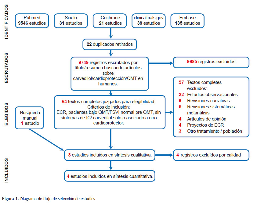 La población del estudio debían ser adultos o niños que iniciaban quimioterapia en ausencia de síntomas previos de insuficiencia cardíaca (IC), cardiopatía estructural o disfunción sistólica (incluyendo sólo FEVI ≥ 50 %). El tratamiento activo debía ser carvedilol (solo o junto a otro tratamiento cardioprotector) y la comparación debía realizarse con placebo o ningún tratamiento cardioprotector. Se desarrolló la búsqueda seleccionando artículos relevantes, excluyendo aquellos no relacionados al tema e identificando duplicados. El diagrama de flujo de los estudios recolectados se construyó siguiendo las recomendaciones PRISMA (22). La existencia de diferencias en la selección entre investigadores fueron resueltas por consenso entre ambos investigadores y un análisis de concordancia de la selección y de la calificación de Jadad fue ejecutado. Las palabras claves de búsqueda fueron: (carvedilol OR beta blocker*) and (chemotherapy OR cardiac toxicity OR anthracycline OR trastuzumab) and (systolic dysfunction OR systolic function OR heart failure OR ejection fraction OR strain).
