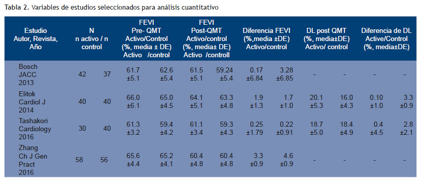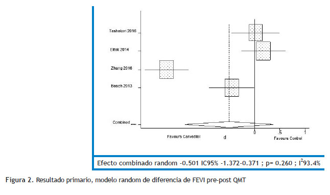 La información de los estudios incluidos fue: número de sujetos por grupo, adultos/niños, tipo y dosis de quimioterapia, dosis de carvedilol, presencia de tratamiento cardioprotector adicional y su tipo, FSVI pre y postquimioterapia y la diferencia entre ambas. Para el análisis estadístico se utilizó STATA 13.