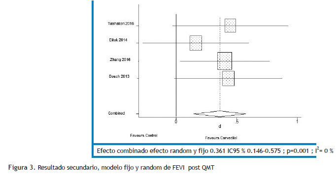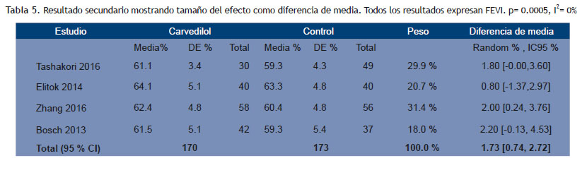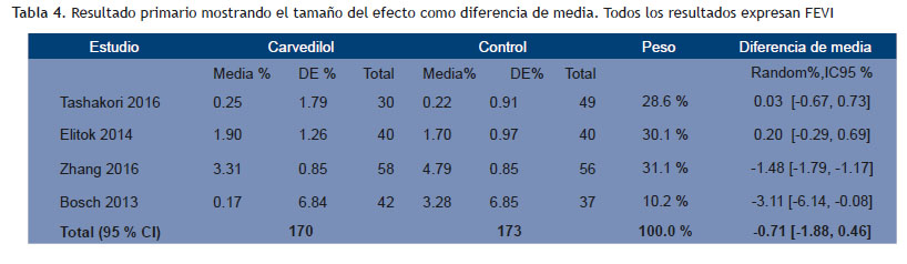 No se encontró diferencias entre grupo carvedilol y control en el resultado primario (d= -0.501 CI 95 % -1.372 -0.371; p 0.260); pero la FEVI fue mejor en el grupo carvedilol tras el tratamiento con quimioterapia con una d= 0.361 CI95 % 0.146-0.575; p 0.001 (resultado secundario) (Figuras 2 y 3). El tamaño del efecto mostrado a través de las diferencias de medias (Tablas 4 y 5). En cuanto a las gráficas de bosque se muestran en los sectores superiores los estudios que evaluaron función sistólica con deformación longitudinal además de FEVI y que utilizaron, además, solo carvedilol como tratamiento activo (Tashakori y Elitok) y en los inferiores aquellos que asociaron otro cardioprotector y sólo evaluaron función sistólica con FEVI (Zhang y Bosch).