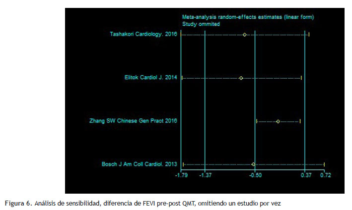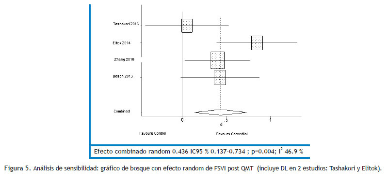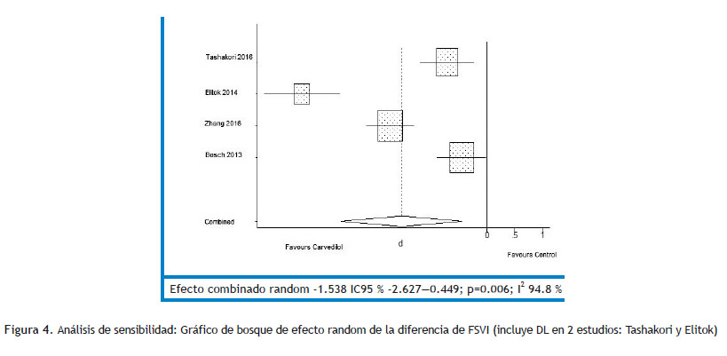El efecto combinado fue obtenido por los modelos de efecto fijo y random, prefiriendo este último por heterogeneidad entre estudios. Los resultados se muestran en gráfica de bosque. Se realizó prueba de sensibilidad del resultado primario y secundario evaluando la diferencia de FSVI a través de otros parámetros diferentes a la FEVI sí estuvieron disponibles y del resultado primario a través de la exclusión del análisis de cada uno de los estudios incluidos. Se realizó análisis de subgrupos comparando carvedilol sólo como tratamiento activo vs carvedilol más otros tratamientos cardioprotectores y se evaluó el tamaño del efecto intra estudio según FEVI vs deformación miocárdica. Se ejecutó test de Begged y Eger para investigar sesgo de publicación. La presente publicación se realiza siguiendo las recomendaciones PRISMA (22,23).