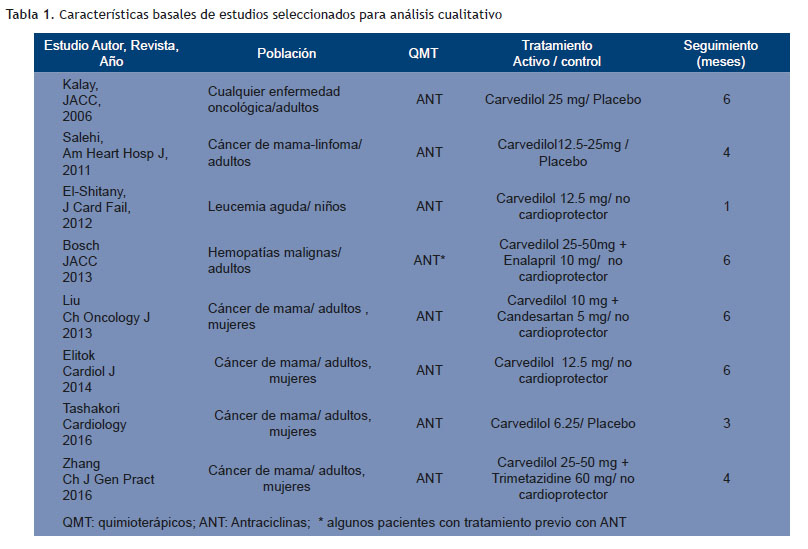 Conclusiones: El carvedilol solo o combinado, se asocia a una mayor fracción de eyección del ventrículo izquierdo, pero no a un menor descenso de la misma al finalizar la quimioterapia. Son necesarios estudios clínicos aleatorizados con mayor población, seguimiento y calidad para determinar la implicancia clínica del uso de carvedilol en pacientes sometidos a quimioterapia.