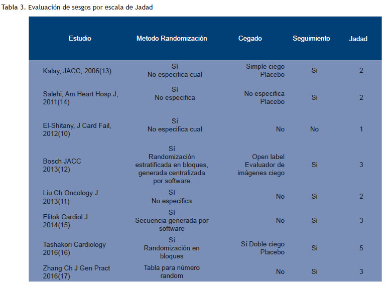 La búsqueda de estudios y la estrategia de evaluación tuvo una concordancia entre investigadores para la etapa de escrutinio de 0.6 CI95 %(0.46-0.75) índice kappa y de 1 para la elegibilidad y la asignación del puntaje Jadad. Las características basales de los trabajos seleccionados, las variables significativas y la evaluación de sesgos se muestran en las (Tabla 1, 2 y 3). Se destaca que los estudios incluidos en el análisis estadístico (Bosch 2013, Elitok 2014, Zhang 2016 and Tashakori 2016) tiene una población adulta, preponderantemente femenina en tratamiento con antraciclinas por cáncer de mama y todos sin historia previa de IC y con FEVI normal basal.