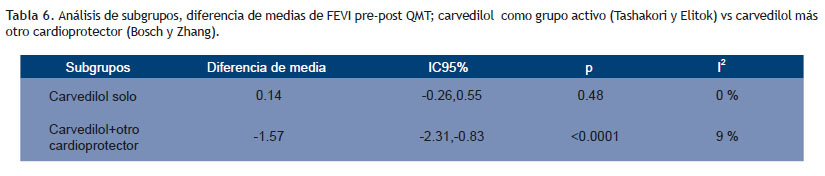 Nuestro MA, así como otros respecto a este tema, muestra gran heterogeneidad de resultados entre estudios. Este hecho se explica porque se incluyeron diferentes enfermedades oncológicas, con diferentes terapias y dosis (aunque las antraciclinas son testeadas en la mayoría de los estudios), y diferentes tratamientos activos efectivizados. Nuestros resultados muestran alta heterogeneidad respecto al resultado primario pero, llamativamente, ninguna heterogeneidad al analizar el resultado secundario. Esto resulta interesante pues nuestro MA incluye una población bastante homogénea de mujeres adultas con cáncer de mama, tratada con antraciclinas y que recibieron, como cardioprotector, carvedilol sólo o asociado en el grupo activo; además la FEVI es el método de evaluación de la FSVI más ampliamente utilizado y validado con una baja variabilidad intra e interobservador. Sin embargo no encontramos una explicación plausible de la diferencia en la heterogeneidad entre el resultado primario y secundario.