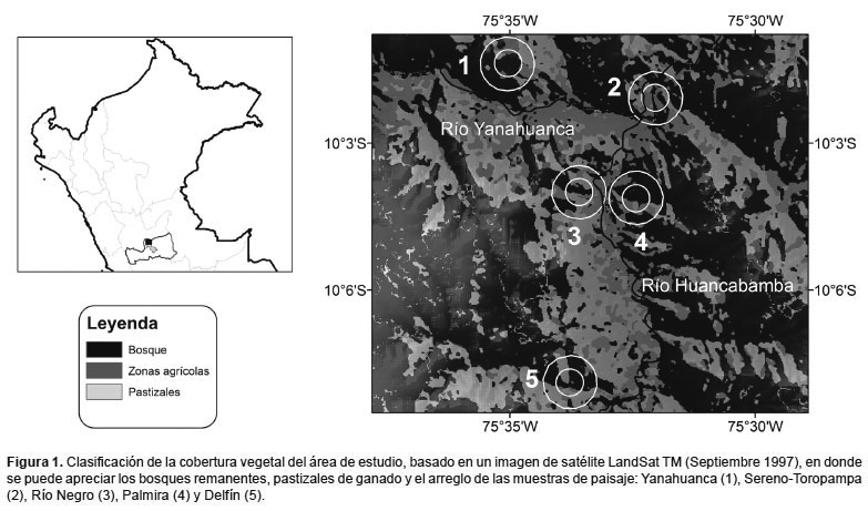 El estudio se realizó en el valle de Pozuzo (Provincia de Oxapampa, Región Pasco) (Fig. 1), el cual está caracterizado por la presencia de zonas antrópicas y remanentes de bosque siempreverde subandino del suroeste de la Amazonía. Oxapampa es ampliamente reconocida por su biodiversidad y cuenta con dos áreas protegidas muy importantes: el Parque Nacional Yanachaga Chemillén y la Reserva Comunal Yanesha. La precipitación anual promedio de Pozuzo es aproximadamente de 2300 mm, con una estación lluviosa entre los meses de noviembre y abril, y una estación seca entre los meses de mayo y octubre. La temperatura es más o menos uniforme a lo largo del año, con un promedio anual de 22,6 °C. En Pozuzo, predomina un paisaje caracterizado principalmente por actividades humanas, en el cual los bosques remanentes ocurren en fragmentos pequeños o parches (< 50 ha) a lo largo de las zonas de pendientes y en fragmentos grandes (> 100 ha) localizados principalmente en las zonas más alejadas de los centros poblados, ambos inmersos en una matriz de pastizales para ganado y tierras agrícolas (Fig. 1). En general, los bosques remanentes presentan un dosel compuesto principalmente de especies de las familias Bombacaceae, Burseraceae, Combretaceae, Euphorbiaceae, Fabaceae, Meliaceae, Moraceae, Polygonaceae, Sapindaceae, Boraginaceae y Arecaceae; un sotobosque con representantes de Melastomataceae y Piperaceae; y un estrato herbáceo dominado por Araceae, Cyclanthaceae y Heliconaceae. Los pastizales para ganado están caracterizados por la dominancia del pasto exótico Brachiaria decumbens con algunos árboles asociados; mientras que las tierras agrícolas incluyen cultivos como la yuca, el plátano, la papaya, el maíz, entre otros.