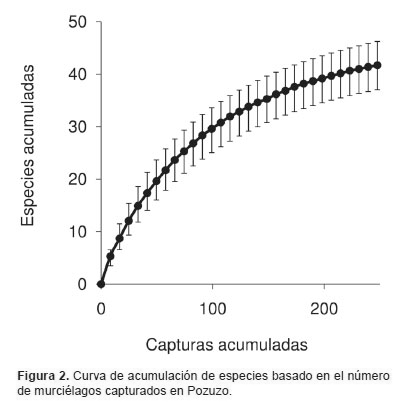El muestreo comprendió un total de 864 m de red con 120 horas trabajadas durante 30 noches (Tabla 1). Se capturaron 256 individuos que correspondieron a 42 especies, 23 géneros y 4 familias (Apéndice 1). La familia con más especies fue Phyllostomidae (38 especies). Entre los Phyllostomidae, la subfamilia Stenodermatinae (21 especies) fue la más diversa. Palmira fue la localidad donde se registró el mayor número de especies y fue la mejor muestreada según los estimadores Chao2 y Jackniffe2, seguidos de Delfín y Río Negro (Tabla 1). En total, en las 30 noches de trabajo se colectó el 76% de las especies esperadas para Pozuzo según el modelo de Clench (58 especies). Además, la curva de acumulación de las especies capturadas en Pozuzo, sugiere que ésta se aproxima a una asíntota (Fig. 2).