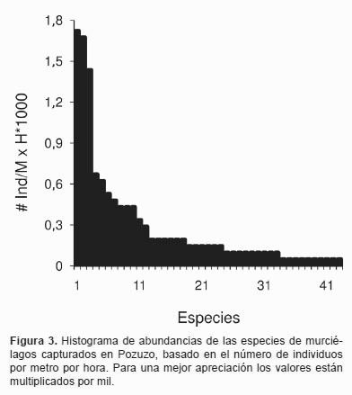 El histograma de abundancia relativa (Fig. 3) revela que existen tres especies dominantes en Pozuzo (Carollia brevicauda, Carollia perspicillata y Platyrrhinus infuscus), las cuales representan cerca del 40% del total de capturas. En cuanto a los gremios tróficos, los frugívoros acechadores de fondo denso fueron el gremio más diverso (54% del total de especies), seguidos de los insectívoros aéreos de espacios de fondo denso (13%) y de los nectarívoros (11%). Pozuzo está caracterizado por especies típicas de tierras bajas como Chiroderma trinitatum, Micronycteris minuta y Thyroptera tricolor, así como, de especies de las vertientes orientales de los Andes como Platyrrhinus albericoi, P. masu, P. nigellus y Sturnira erythromos.