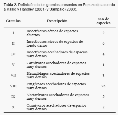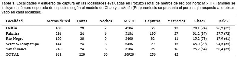 Se elaboraron curvas de acumulación de especies considerando el número de especies capturadas y el número total de capturas para evaluar la calidad del inventario (Soberón & Llorente 1993). Siguiendo las recomendaciones de Colwell y Coddington (1994) las curvas fueron afinadas por medio de eventos aleatorios (100 veces) para cada localidad y para el total de especies capturadas en Pozuzo. Para cuantificar la totalidad del inventario se usaron los estimadores no paramétricos Chao2 y Jackniffe 2 en los datos de capturas, los cuales fueron estimados con el programa EstimateS (Colwell 2005). Finalmente, se estimó la riqueza de especies esperada en Pozuzo basado en el modelo de Clench (Soberón & Llorente 1993). La caracterización de los gremios se basó en Kalko y Handley (2001) y Sampaio et al. (2003). Bajo estas definiciones, se identificaron ocho gremios, los cuales se encuentran compuestos por especies que forrajean en hábitats equivalentes y consumiendo alimentos similares (ver Tabla 2). Como animalívoros se agrupa a los gremios de insectívoros y carnívoros acechadores de espacios muy densos (Stevens 1996).
