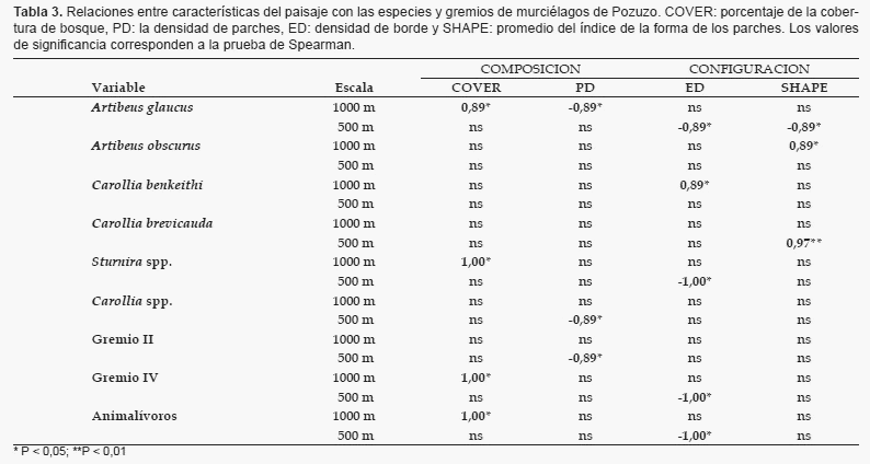 La existencia de una relación entre las variables que caracterizaron la estructura del paisaje con la riqueza de especies, la abundancia de cada especie y la abundancia de los gremios tróficos (N= 5) fue analizada con la prueba no paramétrica de Spearman. Esta prueba es útil con tamaños pequeños de muestra y cuando se desconoce la distribución de los datos; de modo que nos permite determinar si existe una relación monotónica entre dos variables (Ramsey & Schafer 2002). Con esta prueba también se analizó la existencia de correlación entre las variables que caracterizan el paisaje. Estos análisis se realizaron en el programa R 2.10.1 (R Development Core Team 2005).