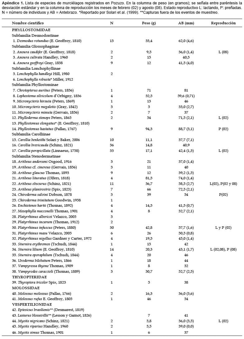 A pesar de ser una zona altamente perturbada y además ubicada por encima de los 800 m de altitud, la diversidad de murciélagos de Pozuzo es realmente destacable. En total se documentan 46 especies incluyendo registros adicionales reportados en Solari et al. (1999) y capturas fuera de los eventos de muestreo (Apéndice 1). Es más, según el modelo de Clench se podría esperar hasta 12 especies más. En efecto, la composición de especies es muy similar a la registrada en altitudes similares del Parque Nacional Yanachaga Chemillén con 47 especies (Vivar 2006).