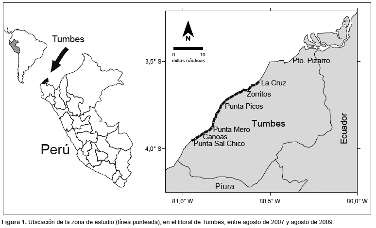 Área de estudio.- La zona de estudio comprende el litoral de Tumbes, Perú; entre las playas Barrio El 19, La Cruz (3º38'9,5"S - 80º36'2,48"W), y Punta Sal Chico (3º57'21,3"S - 80º57'45,72"W), desde la línea de costa hasta una distancia aproximada de 500 m (Fig. 1). A lo largo de esta zona, de aproximadamente 58 km de extensión, se encuentran las localidades de Zorritos, Acapulco, Punta Mero y Cancas, caracterizadas por presentar numerosas quebradas que permanecen activas en épocas de lluvia y secas el resto del año, además de algunas playas amplias, muchas playas pequeñas con sus respectivas puntas, y algunas playas intercaladas con peñas sumergidas en la zona submareal (Ordinola et al. 2010). Las playas amplias en su mayoría son de suave pendiente, con escasa vegetación, de fácil acceso desde el mar, y con caladeros visitados frecuentemente por pescadores artesanales de toda la región. La temperatura superficial del mar (TSM) varía de 25,4 a 30,4 ºC, y la salinidad entre 29,1 y 34,0 ups (Montero et al. 2010).