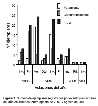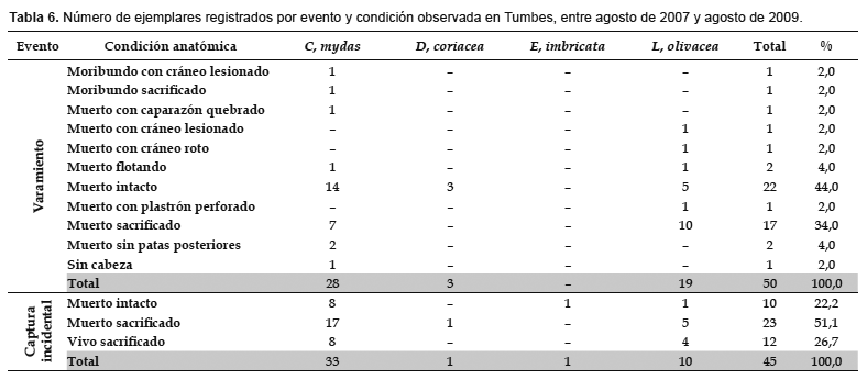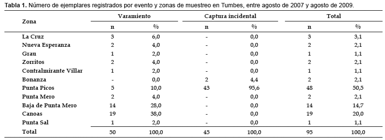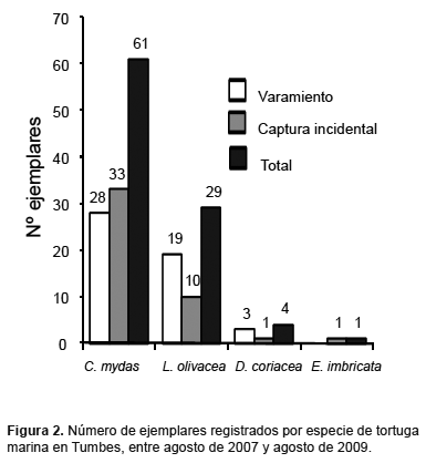 En la Región Tumbes, desde agosto de 2006 hasta agosto de 2009 se registraron 95 ejemplares de cuatro especies de tortugas marinas, C. mydas (64,2%), L. olivacea (30,5%), D. coriacea (4,2%) y E. imbricata (1,1%); correspondiendo el 52,6% a varamientos y el 47,4 % a capturas incidentales (Fig. 2).