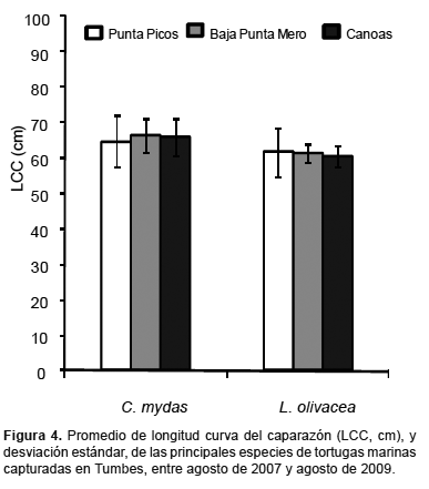 Análisis de datos.- Los datos de LCC permitieron determinar el porcentaje de los estados de madurez aparente (jóvenes, sub-adultos y adultos), considerando la talla promedio de hembras anidantes de acuerdo a Steyermark et al. (1996) para D. coriacea (128 cm LCC), Zárate et al. (2007) para C. mydas (84 cm LCC), Barrientos y Ramírez (2008) para L. olivacea (65 cm LCC), y Miller (1997) para E. imbricata (79 cm LCC).