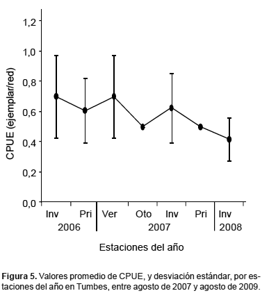 A pesar que los promedios de la CPUE fueron mayores en invierno de 2006 y verano de 2007, cada uno con 0,70 ± 0,27 DS ejemplar/red, este parámetro tuvo niveles similares de variación entre épocas climáticas. Esto indicaría que el ecosistema marino de la Región Tumbes posee características ambientales estables en todo el año. De esta manera, es probable que los cambios en algunas características físico-químicas de la columna de agua, en especial de los aportes fluviales en la época de verano, no tengan ningún efecto en la dinámica de las poblaciones de tortugas marinas y los valores de CPUE.