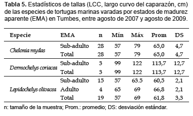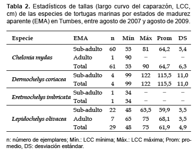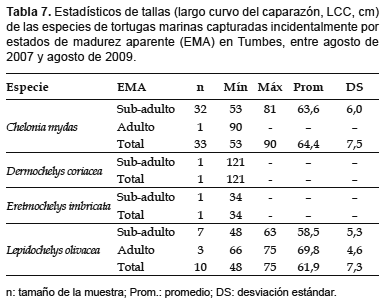 El 97% de ejemplares de C. mydas se consideraron sub-adultos (63,6 ± 6,0 DS cm LCC; n= 32); el 30% de L. olivacea, adultos (69,8 ± 4,6 DS cm LCC; n= 3); y los únicos ejemplares de D. coriacea (121,0 cm LCC) y E. imbricata (34,0 cm LCC), sub-adultos (Tabla 7).