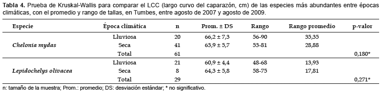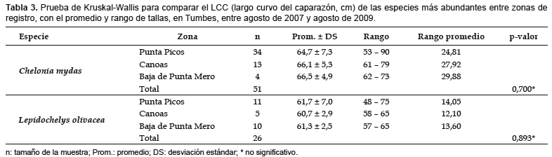 Chelonia mydas y L. olivacea fueron las especies más frecuentes, y en Punta Picos, Canoas y Baja de Punta Mero (zonas en que se registraron más de dos ejemplares por especie), presentaron promedios de LCC similares durante el estudio (Fig. 4), con un amplio espectro de tamaños. Según la prueba de Kruskal-Wallis, las tallas de estas especies no presentaron diferencias significativas entre zonas de varamientos y capturas incidentales (Tabla 3) ni entre épocas climáticas (Tabla 4).