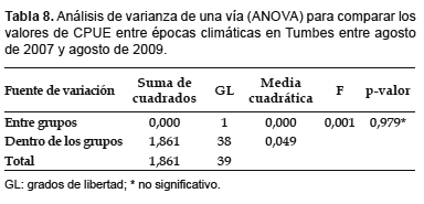 Los datos de CPUE no se ajustaron a una distribución normal (prueba de Kolmogorov-Smirnov: D= 0,462; p= 0), pero tuvieron igualdad de varianzas (prueba de Levene, W= 0,275; p> 0,05), por lo que se realizó el análisis de varianza (ANOVA) para comparar los valores de CPUE entre épocas climáticas, en el supuesto de que la falta de normalidad no induce necesariamente a rechazar una hipótesis nula cuando existe homogeneidad de varianzas (Underwood 1997).