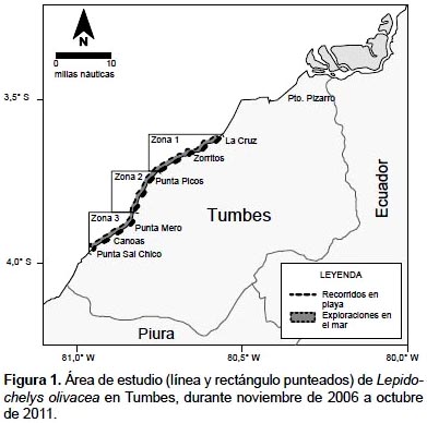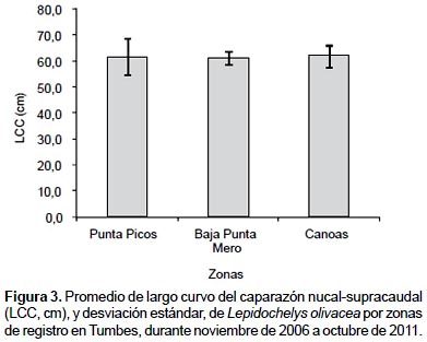 Colecta de información y muestreo.-La información biométrica de L. olivacea provino de la base de datos de los registros de varamientos y capturas incidentales de tortugas marinas en Tumbes, recolectados en los recorridos de playas y exploraciones en el mar efectuados durante noviembre de 2006 a julio de 2008, y fue complementada con los datos recolectados en los recorridos de playas efectuados en agosto de 2009, octubre de 2010 y durante enero, febrero y octubre de 2011, por personal científico de IMARPE Tumbes.