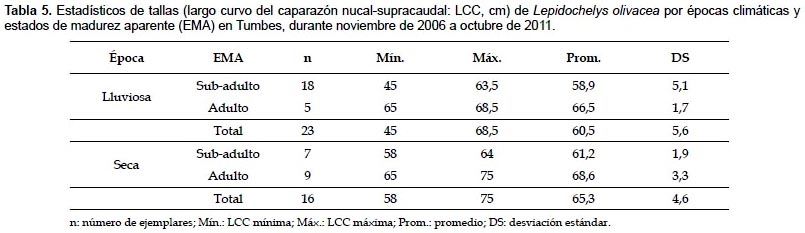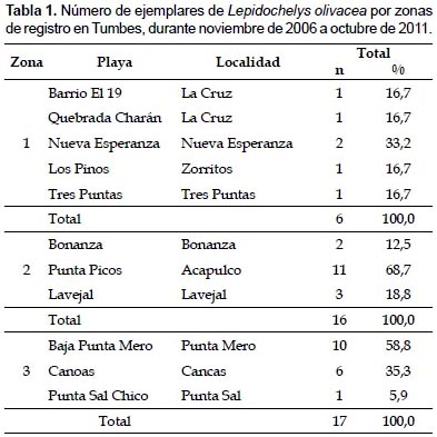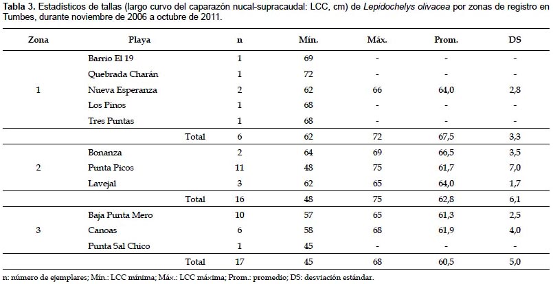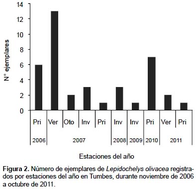 En Tumbes, durante noviembre de 2006 y octubre de 2011, se registraron 39 ejemplares de L. olivacea, correspondiendo el 74,4% a varamientos y el 25,6% a capturas incidentales. Los mayores registros ocurrieron en verano de 2007, primavera de 2010 y primavera de 2006 (Fig. 2) y principalmente en Punta Picos (28,2%), en la zona 2, y en Baja de Punta Mero (25,6%) y Canoas (15,4%), en la zona 3 (Tabla 1). Las tallas variaron de 45 a 75 cm LCC, con un promedio de 62,5 ± 5,7 cm LCC (Tabla 2).