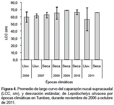 Estructura de tallas según épocas climáticas.- Del total de ejemplares, el 59% se registró en la época lluviosa, y el restante en la época seca. En la época lluviosa, las tallas variaron de 45 a 69 cm LCC (60,5 ± 5,6 cm LCC; n= 23); mientras que en la época seca, de 58 a 75 cm LCC (65,3 ± 4,6 cm LCC; n= 16) (Tabla 4). Los mayores promedios de LCC se registraron en la época seca, principalmente en 2009, 2010 y 2011 (Fig. 4).